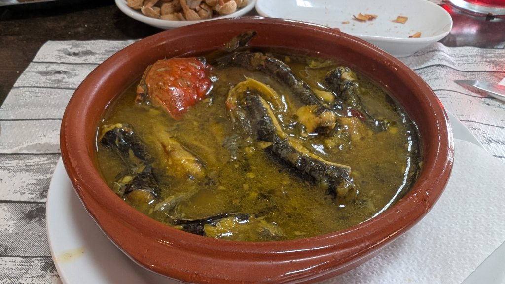 D’una recomanació del gruaire que em va ajudar amb un neumàtic punxat, en vaig treure un parell de llocs per esmozar de forquilla i ganivet (a recalcar el ganivet, garantia de fato contundent) a Deltebre. Lo bar del Txato (actualització 2025: ha mutat a bar de vins), per on havia passat molts cops per davant amb el cotxe però no hi havia parat, que té bon ambient i bon jalar. Hi vaig menjar les galtes en salsa de la foto de dalt, amb unes inesperades patates i ou ferrat de regal, però també hi tenien per exemple uns peus de porc fregits o uns callos amb cigrons. La segona recomanació a Deltebre és La Tasca 3 cantons, que té un gran assortit. Queda prop del Nicanor, un bar amb un interior ben curiós i on sovint anem a esmorzar els seus entrepans de truita (el meu fill vota pel 4 carreteres amb truita, pebrot i pernil). També a Deltebre, però a la part de Jesús i Maria, el Bon Gust. Molt bons esmorzars de forquilla, anguila en suc picanteta i brasa a ple funcionament.